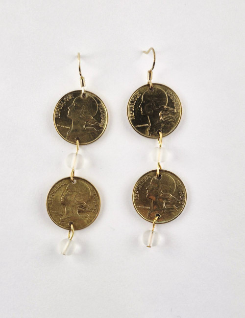 La pièce de Franc revisitée au bout des oreilles pour s'associer aux perles en verre dans ces boucles JIMMY de la sélection iconique La Petite Bohêmienne.